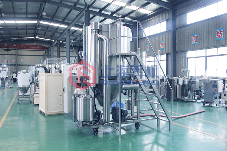 6.為了防止材料受到污染并延長設備的使用壽命,與材料接觸的所有部件均由不銹鋼制成。 噴涂后,液體霧化成分散的顆粒,表面積大大增加。 在與熱空氣接觸后,干燥過程可以在很短的時間內完成。