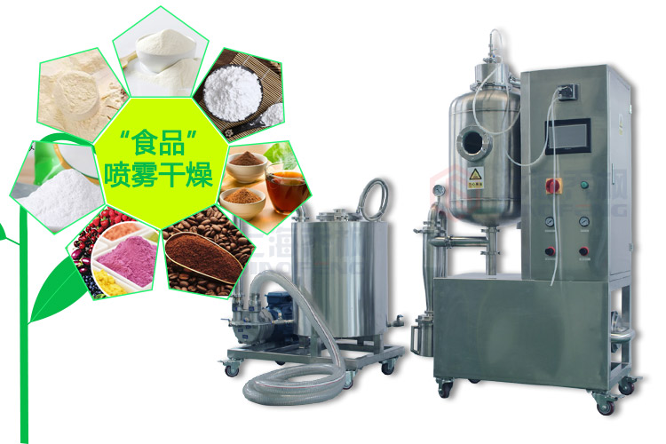 噴霧干燥是系統化技術應用于物料干燥的一種方法。于干燥室中將稀料經霧化后,在與熱空氣的接觸中,水分迅速汽化,即得到干燥產品。該法能直接使溶液、乳濁液干燥成粉狀或顆粒狀制品,可省去蒸發、粉碎等工序。通過機械作用,將需干燥的物料,分散成很細的像霧一樣的微粒,(增大水分蒸發面積,加速干燥過程)與熱空氣接觸,在瞬間將大部分水分除去,使物料中的固體物質干燥成粉末。